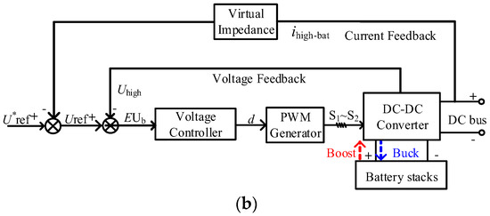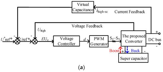 For a HESS, the SC interface converter should be able to respond to fast bidirectional power fluctuations immediately. Therefore, a virtual capacitor droop (VCD) control is adopted for this converter. At the same time, the battery interface converter uses a virtual resistance droop (VRD) control to make the battery provide total power at steady state. Due to using the VCD and VCR control, the HESS can adapt to the distributed nature of the DC micro-grid and increase system reliability and scalability [35,36]. The specific control strategy is shown in Figure 8. As shown in Figure 8, the voltage controller is used to follow the reference voltage Uref. The voltage Uhigh and the currents ihigh-sc and ihigh-bat are obtained by the sensor samplings. ihigh-sc refers to the output current of the SC interface converter and ihigh-bat refers to the output current of the battery interface converter.