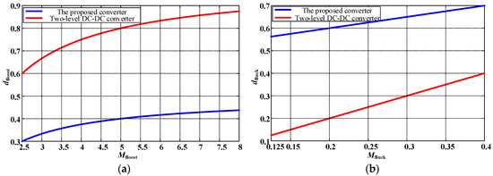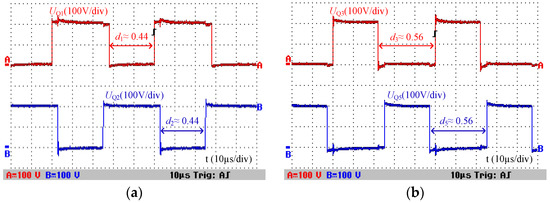 Under the same voltage conversion ratio, 0 shows the comparison between the proposed and the traditional two-level bidirectional converters. According to Figure 9, when the voltage conversion ratio is 8 in the step-up mode, the duty cycles of the proposed and the traditional converters are 0.4375 and 0.875, respectively; in step-down mode, when the voltage conversion ratio is 0.125, the duty cycles of the proposed and the traditional converters are 0.5625 and 0.125, respectively. Compared with the traditional converter, the proposed one can avoid the extreme duty cycle while achieving a high voltage conversion ratio. What is more, the higher the voltage conversion ratio, the closer the duty cycle is to 0.5. When the duty cycle approaches 0.5, the time used to maintain the ON and OFF state for all power semiconductors is nearly equal in each period, which is beneficial to avoid the narrow pulse of PWM voltage waveforms while the high voltage conversion ratio is achieved.