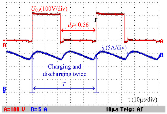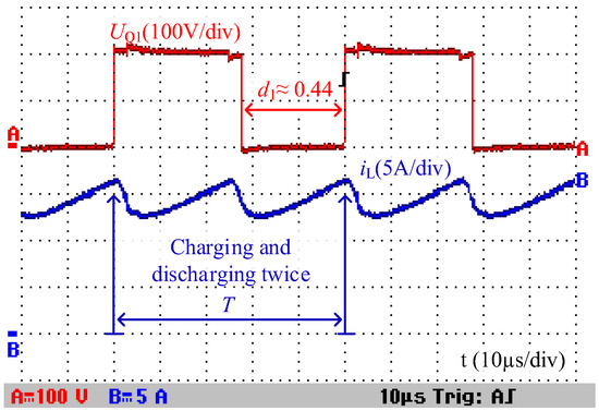 The PWM voltages of power semiconductors and the inductor current waveforms are shown in Figure 11 and Figure 12. The PWM voltage of each power semiconductor is about 200 V, approximately equal to the high-voltage side Uhigh, which validates the analysis in Section 3. According to Figure 11 and Figure 12, the voltage gain MBoost of the proposed converter is 8 and the duty cycle dBoost is about 0.44. The ON state time of the power switches Q1–Q2 is about 0.44 T and the ON state time of the power switches Q3–Q5 is about 0.56 T. At that high voltage gain, both the ON and OFF state times of those power switches are close to 0.5 T, which is effective for avoiding the narrow pulse of the PWM voltage waveforms. Due to using the synchronous rectification, the turn on and turn off of the controlled MOSFETs Q3, Q4, and Q5 realize the ZVS (zero voltage switching), e.g., the gate signal S4 and the voltage stress of Q4 as shown in Figure 13. According to Figure 11, the inductor L is charged and discharged twice during each switching period. Therefore, the equivalent switching frequency of the proposed converter is double that of the real switching frequency f. This feature is beneficial to improve the dynamic performance and reduce the inductor current ripple of this converter.