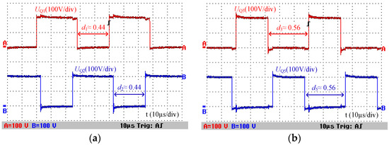 - Avoiding the narrow pulse of PWM voltage waveforms when a high voltage conversion ratio is achieved: It costs a little time to turn a power semiconductor on and off, thus the ideal narrow pulse of the PWM voltage waveform is difficult to realize. The higher the voltage conversion ratio of the proposed converter is, the closer the duty cycle is to 0.5. When the duty cycle approaches 0.5, the time used to maintain the ON and OFF state for all power semiconductors is nearly equal in each period, which is beneficial to avoid the narrow pulse of PWM voltage waveforms while a high voltage conversion ratio is achieved.