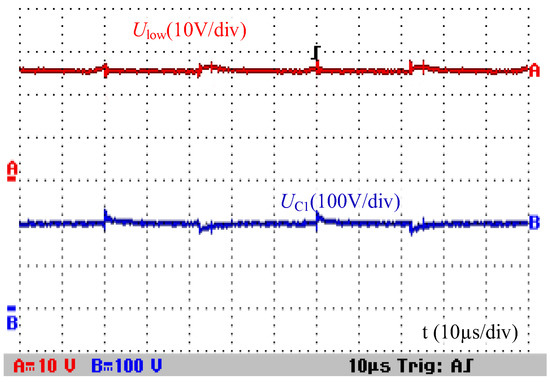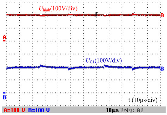 The voltage across clamp capacitor C1 is approximately 200 V, being well-consistent with Uhigh as shown in Figure 14. Therefore, in the switching state 01, the clamp capacitor C1 can maintain the forward bias of the anti-parallel diode of Q5. The feature that all power semiconductors turn on and off only once during each switching period can be achieved. This is beneficial to avoid narrow pulses of the PWM voltage waveform at high voltage gain.