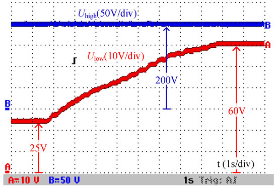 In the step-up mode, Ulow and Uhigh are the input and output voltage, respectively. The output voltage can stay around the reference value of 200 V. The output/input voltage waveforms shown in Figure 15 can be obtained when changing the input voltage dynamically. According to Figure 15, when the input voltage varies continuously from 25 V to 60 V, the output voltage can stay around 200 V. The conclusion can be obtained from Figure 15 that the proposed converter can obtain a wide voltage conversion ratio from 3.3 to 8 in step-up mode.