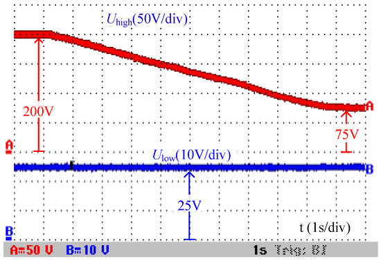In the step-down mode, the input voltage is Uhigh and the output voltage is Ulow. The output voltage can also stay around the reference value of 25 V with the action of the voltage control loop. The output/input voltage waveforms shown in Figure 20 can be obtained when changing the input voltage dynamically. According to Figure 20, when the input voltage varies continuously from 200 V to 75 V, the output voltage can stay around 200 V. The conclusion can be obtained from Figure 20 that the proposed converter can obtain a wide voltage conversion ratio from 1/8 to 1/3 in step-down mode.