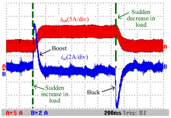 With the DC load being suddenly increased and decreased, changes in the output currents are shown in Figure 21, where ibat and isc denote the output currents of the battery and the SC, respectively. When the DC load required power changes from 400 W to 650 W suddenly, the SC compensates for the required power immediately by increasing the current isc from 0 to 6 A in 20 ms approximately, which protects the battery by avoiding a sudden change in current and prolongs its life. Gradually, the task of supplying the power shortage is transferred from the SC to the battery. The isc falls to 0 from 6 A along with the ibat rising from 8 A to 13 A. Similarly, when the DC load required power changes from 650 W to 400 W suddenly, the current isc varies from 0 to −6 A in 20 ms approximately. As a result, the current from the battery decreases from 13 A to 8 A gradually, and the current of the SC returns to 0 from −6 A. When the DC load required power suddenly increases or decreases, the SC can respond quickly to compensate for the power gap between the battery and the DC load. In this situation, the service life of the battery is extended because of the slow changes in its output current. It can be concluded from Figure 21 that the proposed converter can cooperate well in the HESS whether the load is suddenly changed or not.
