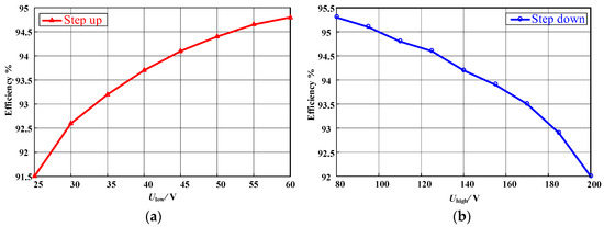 The efficiencies of the proposed converter in the step-up and step-down modes are shown in Figure 22. In step-up mode, Uhigh is 200 V and Ulow varies from 25 V to 60 V continuously; in step-down mode, Ulow is 25 V and Uhigh varies from 80 V to 200 V continuously. According to Figure 22, the efficiency varies from 91.52% to 94.80% in step-up mode, which is slightly lower than that in the step-down mode (varies from 92.01% to 95.30%). With the constant load power in step-up mode, the efficiency decreases accompanied by the input voltage declining due to the increasing losses caused by the growing input current. In the step-down mode, the efficiency decreases with the increase of high side voltages. Due to the increase in the high side voltages, the voltage stresses of the power semiconductors increase. Therefore, the turn on/off losses of the power semiconductors will increase.