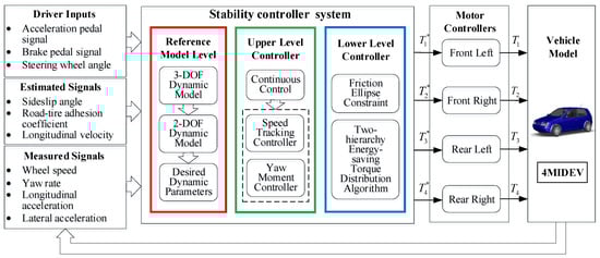 In general, the steering stability control of a 4MIDEV is mainly designed as a hierarchical structure, including an upper-level controller with direct yaw moment control (DYC) and a lower-level controller with a torque distribution algorithm [,]. In previous studies, the DYC in the upper-level controller usually chooses the sideslip angle and the yaw rate or one of them as the control target [,]. Hu et al. [] investigated a robust yaw moment control for motion stabilization to realize an accurate control of the yaw rate. Ding et al. [] developed two categories of sliding mode control for DYC to control the yaw rate of the vehicle. However, the integrated control of the yaw rate and the sideslip angle is usually determined after the vehicle is judged to be losing stability. For example, Zhai et al. [] and Kang et al. [] separately developed a stability judgment controller and a supervisory controller to determine the control mode, in order to control both yaw rate and sideslip angle after judging whether the vehicle tends to be unstable. This kind of upper-level controller with stability judgement turns out to improve the steering stability to a certain degree, but may cause instability in extreme conditions because of the delayed control []. At the same time, compared with a control mode working continuously, a larger torque is also required for this control mode to restrain the tendency of the vehicle to lose its stability, which is not conducive to energy saving. A continuous upper-level controller is needed to better ensure the steering stability and improve the energy consumption efficiency in extreme situations.
