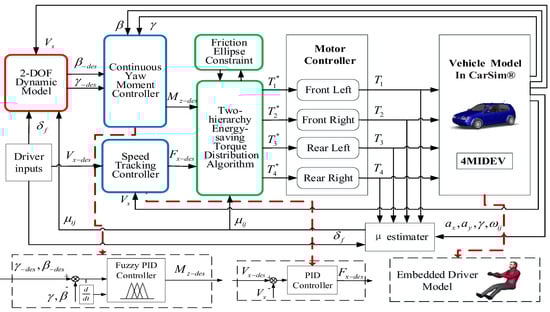 The steering stability controller proposed for the 4MIDEV in this paper is designed as a hierarchical structure, including a reference model level, an upper-level controller, and a lower-level controller, as shown in Figure 1. The reference model level is designed to acquire the desired steering dynamic parameters according to the driver inputs and the estimated or measured signals. The upper-level controller generates the virtual dynamics control commands to target the desired steering dynamic parameters. The lower-level controller allocates the virtual commands to four in-wheel-motor controllers as torque commands to meet the drivers’ steering requirements. The proposed steering-stability controller schematic is shown in Figure 2. The two-degree-of-freedom (2-DOF) dynamic model is introduced in the reference model level to generate the desired yaw rate and sideslip angle for vehicle stability, according to the driver inputs and signals inputs from the driver model. The continuous upper-level controller consists of a speed-tracking controller with proportional-integral-derivative (PID) control and a yaw moment controller with fuzzy PID control, which realize the integrated control of vehicle speed, sideslip angle and yaw rate based on the 2-DOF dynamic model and drive inputs. A two-hierarchy energy-saving torque distribution algorithm is developed in the lower-level controller to distribute the motor-driving torques or the regenerative-braking torques Ti (i = 1, 2, 3, and 4). Ti* are the commands to four motor controllers from the torque distribution algorithm.