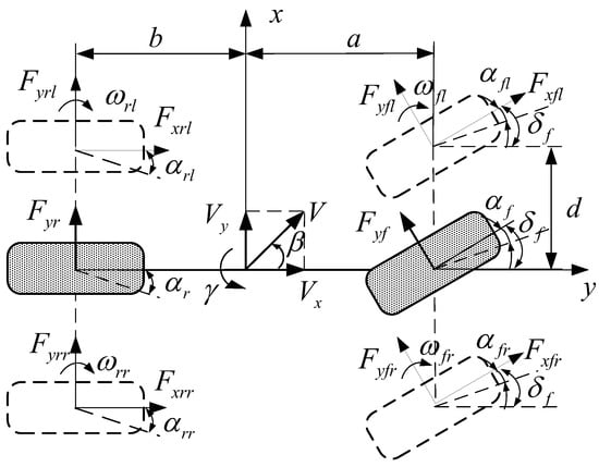 where and respectively denote the longitudinal and lateral acceleration, denotes the mass of the vehicle, is the derivative of the yaw rate , and are, respectively, the derivative of the longitudinal velocity and the lateral velocity , is the yaw inertia of the vehicle. , , and are, respectively, the total longitudinal force, lateral force, and yaw moment of the vehicle, which can be defined by: