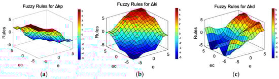The fuzzy rules for the yaw-moment controller: (a) fuzzy rules for Δkp; (b) fuzzy rules for Δki; (c) fuzzy rules for Δkd.