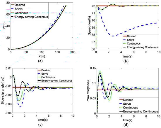 Figure 6c,d show the sideslip angle and yaw rate response of the vehicle, respectively. Under the energy-saving continuous control, the sideslip angle and yaw rate had the shortest response time and the minimum overshoot. In addition, the ordinary continuous control showed a worse steering dynamics response, and the servo control was the worst.