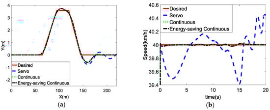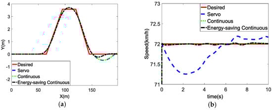 Figure 8a,b show the vehicle’s track and speed response, respectively. It can be seen that, after the vehicle enters the second straight line, the trajectory of the servo control produces a quasi-continuous oscillation with a large fluctuation of the vehicle speed, indicating that the vehicle almost loses its stability. However, the energy-saving continuous control and ordinary continuous control can restrain the trend of instability before the vehicle loses controllability, and the energy-saving continuous control performs a little better.