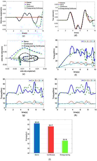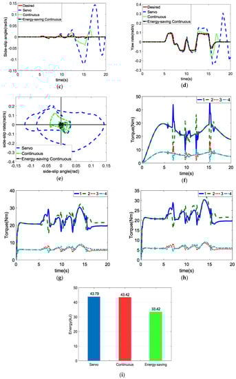 Figure 6f–h show the torque of each in-wheel motor under the servo control, ordinary continuous control, and energy-saving continuous control, respectively. It can be seen that the servo stability controller has a more stable motor torque output than the other two controllers because it does not work unless the vehicle is about to lose stability. Despite the good torque response under the servo control, the servo control sacrifices vehicle stability and controllability considering the response of the other stability parameters.