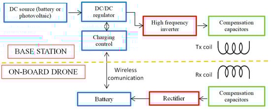 - Campi, T.; Cruciani, S.; Maradei, F.; Feliziani, M. High efficiency and lightweight wireless charging system for drone batteries. In Proceedings of the 2015 AEIT International Annual Conference (AEIT), Cagliari, Italy, 20–22 September 2017; pp. 1–5. [Google Scholar]