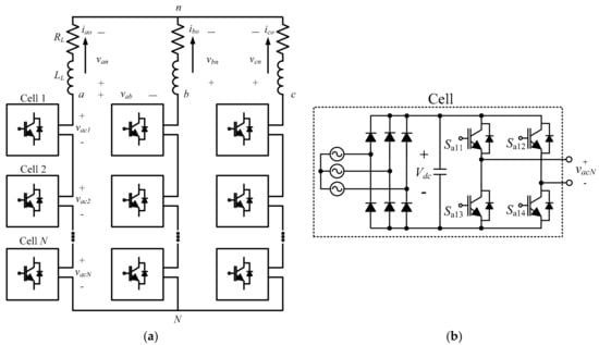 (a) Three-phase multilevel Cascaded H-bridge (CHB) inverter with N cells; (b) structure of a cell.