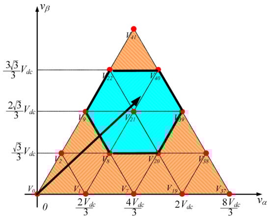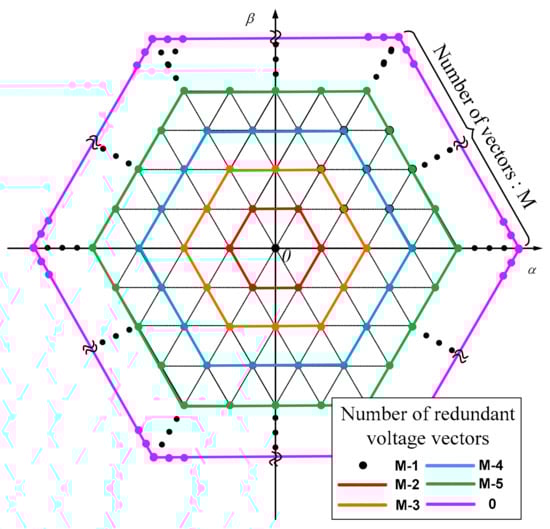 Figure 2 shows the voltage vector diagram of the multilevel CHB inverter with M-level, in which the number of redundant voltage vectors are included. It can be seen that the outer voltage vectors possess less redundant voltage vectors than their inner counterparts. When the voltage level increases in the multilevel CHB inverter, the number of voltage vectors and the number of the redundant voltage vectors quickly increases as well. In order to reduce the redundant vector state in the CHB inverters, a voltage vector, which can minimize a common-mode voltage among numerous redundant vectors, is selected []. The number of non-redundant voltage vectors, Nnr, according to the voltage level, can be calculated as