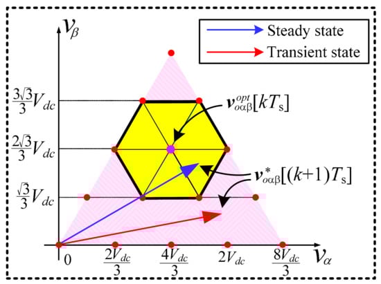 The reference voltage vector obtained using Equation (15) is compared using a cost function with the candidate voltage vectors to determine a future optimal voltage vector that enables a future load current vector to track a reference current vector. During steady state, only an optimal vector at a present step and its adjacent vectors, similar to the MPC-conv2 method, are considered as a candidate-vector subset in the proposed method. A cost function to determine an optimal voltage vector in steady state, hsteady, is defined with seven adjacent voltage vectors as