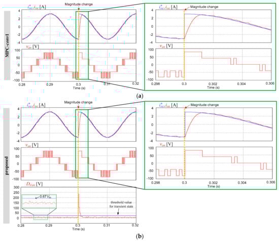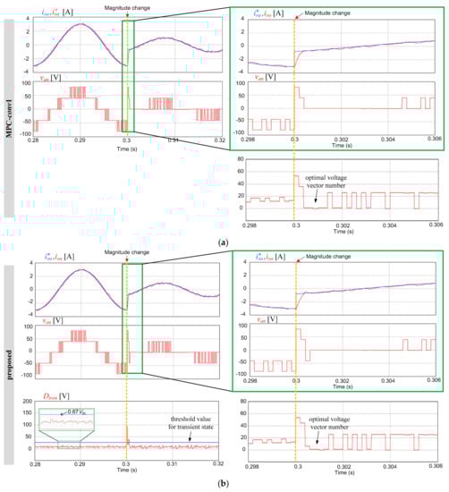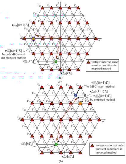 Figure 7 shows how the proposed method and the MPC-conv1 method select optimal voltage vectors under transient conditions. Assume that both methods select V28 as the optimal vector at the kth step because it is the closest one to the reference vector at the present step . In the case that a reference vector, , moves at (k + 1)th step because of a transient state, as shown in Figure 7a, it is seen that both the proposed and the MPC-conv1 methods select the vector V18 as the optimal vector, which makes the two methods produce the same dynamic response. If a reference vector, , moves at (k + 1)th step, as shown in Figure 7b, the MPC-conv1 method, considering all the voltage vectors, chooses V50 as the optimal vector at (k + 1)th step, which is the nearest one to the reference voltage. On the other hand, the proposed method selects the vector V49 as the optimal vector at (k + 1)th step, because the reduced set of the proposed method does not include the voltage vector V50. Although the proposed method yields a slightly slower dynamic response than the MPC-conv1 method because of the reduce set of candidate voltage vectors, it should be noted that the two vectors, V49 and V50, selected by the proposed and the MPC-conv1 methods, respectively, are adjacent vectors with a difference of 0.67Vdc. Thus, the selection processes of the optimal voltage vectors by the two methods are similar after the transitions, and, therefore, the proposed method can reduce the computational complexity of the algorithm without significantly reducing the dynamic speed.