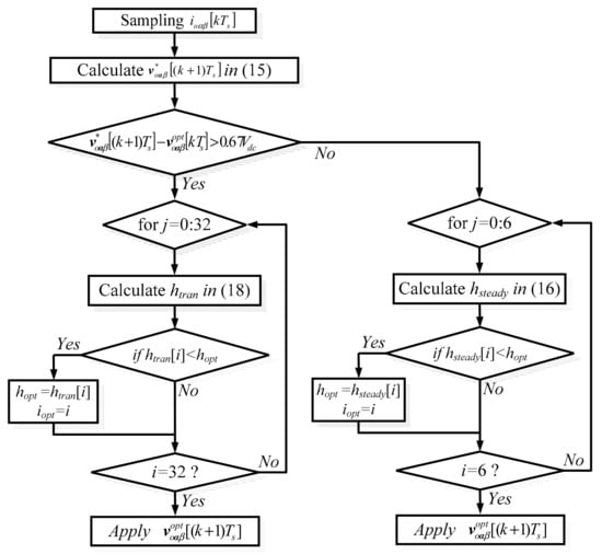 where, and are the α and β components of seven adjacent one-step future voltage vectors in a hexagon closest to a present optimal voltage vector. The proposed method uses the cost function with only the neighboring vectors of an optimal vector at a present step, as in the MPC-conv2 method, in which the error terms are replaced with the voltages in Equation (16) instead of the currents in Equation (10). Thus, the proposed method results in a similar performance to that of the MPC-conv2 method in terms of harmonic spectrum performance of load currents and voltage waveforms during steady states.