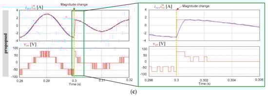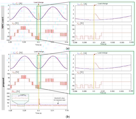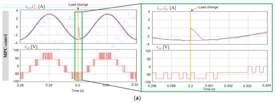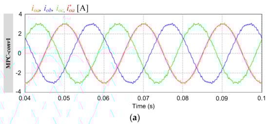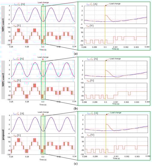 Figure 14 shows the simulation results of the a-phase load current (ioa), a-phase reference current (), and a-phase voltage (van) obtained using the three methods during the transient state of a load change. Like the magnitude step-change of the reference currents in Figure 12, different transient responses are exhibited in Figure 14. It is clearly seen in Figure 14 that the proposed and MPC-conv1 methods produced the same fast transient responses as well as the same inverter voltage waveforms, whereas the MPC-conv2 method, with only the neighboring voltage vectors, produces a slow transient response. Therefore, it can be inferred that the proposed method can achieve a fast dynamic speed, similar to the MPC-conv1 method, despite a reduced number, by approximately a half, of candidate voltage vectors.
