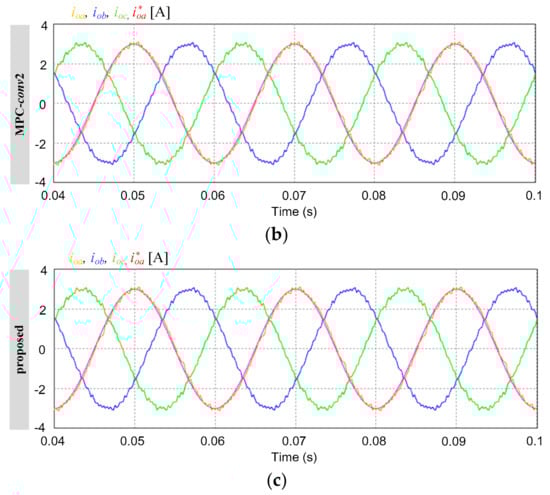 Simulation waveforms of the three-phase load currents (ioa, iob, ioc) and the reference output current () in steady state from the (a) MPC-conv1 method, (b) MPC-conv2 method, (c) proposed method.