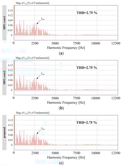 Simulation waveforms of the Fast Fourier Transform (FFT) analysis of a-phase load currents (ioa) in steady state from the (a) MPC-conv1 method, (b) MPC-conv2 method, (c) proposed method.