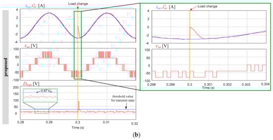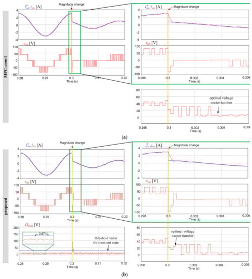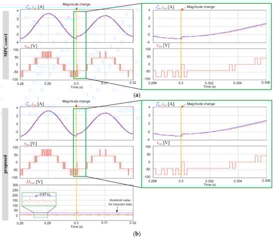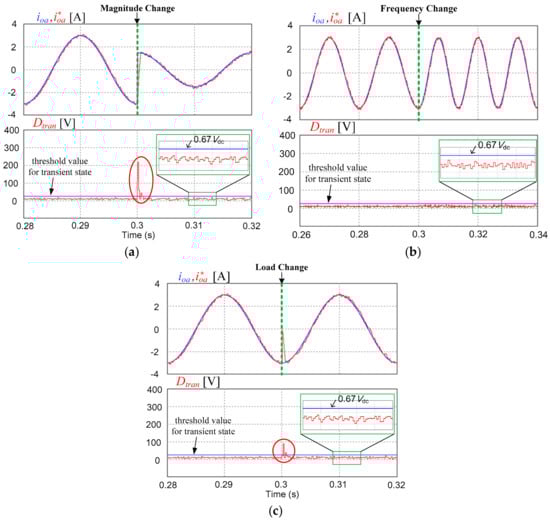 Figure 11 shows the simulated waveforms of the a-phase reference current, a-phase actual current, and a determinant value Dtran under a transient-state condition, such as a magnitude change of the reference currents from −3 A to 1.5 A, a frequency change of the reference currents from 50 Hz to 75 Hz, and a load change from 20 Ω to 10 Ω in the proposed method. During the step-changes in the reference current magnitude and the load resistance in Figure 11a,c, it can be observed that the determinant value Dtran is kept below the threshold value to interpret a next step as a steady state before the transient conditions occur. However, the value quickly increases in both plots under transient conditions. Once the transient phase has lapsed in both plots, the determinant value Dtran decreases to a value lower than the threshold value. On the other hand, it can be seen from Figure 10b that the value Dtran remains lower than the threshold value, irrespective of the step-change in frequency of the reference currents. This is because the frequency change produces only rotational speeds of the reference current and voltage vectors without changes in magnitude. Therefore, similar to the steady states, the step-change in the frequency of the reference currents can be quickly followed by considering only the adjacent vectors of an optimal voltage vector. The determinant value Dtran can then be utilized to accurately identify a transient state with recognizable values between steady states and transient states.