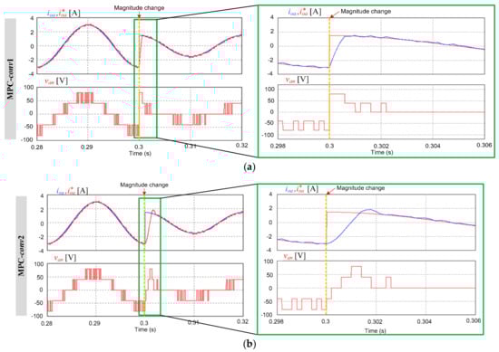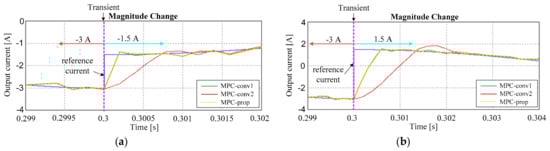The dynamic speeds of the actual load currents obtained from all three methods under transient conditions are compared in Figure 15, during step-change in the reference current magnitude from −3 A to −1.5 A, reference current frequency from 50 Hz to 75 Hz, and load change from 20 Ω to 10 Ω. In the case of the magnitude change of the reference current from −3 A to −1.5 A, as shown in Figure 15a, the MPC-conv2 method experiences the transient period for ~0.8 ms, which corresponds to four sampling periods. On the other hand, the transient period of the proposed method, which is almost the same as that of the MPC-conv1 method, is 0.2 ms, corresponding to one sampling period. Figure 15b shows the step-change of the reference current magnitude from −3 A to 1.5 A, which is a larger current change than in Figure 15a. The MPC-conv2 method undergoes the transient phase for 2.4 ms, whereas the proposed and the MPC-conv1 methods complete the transient period after approximately 0.6 ms. Therefore, the proposed method presents load current dynamics that is four times faster than that of the MPC-conv2 method in both cases. Furthermore, the proposed method exhibits a transient response as fast as the MPC-conv1 method, even when considering that it requires approximately half less voltage vectors than the MPC-conv1 method. In the case of the frequency change of the reference current from 50 Hz to 75 Hz, there is no observable difference in each method, as shown in Figure 15c. As depicted in Figure 15d, in the case of the load change, the transient response time of the MPC-conv2 takes 1.7 ms, while it takes 0.6 ms in the case of the proposed and the MPC-conv1 methods. As a result, the proposed method results in a dynamic speed that is as fast as that of the MPC-conv1 method in the step-changes, even with a reduced calculation complexity during the transient states. However, the reduced set of voltage vectors used in the proposed method can lead to a deteriorated performance, which corresponds to a slower dynamic speed, depending on the transition conditions. The proposed method can have exactly the same performance as the MPC-conv1 in transient or can show a slightly slower dynamic speed than the MPC-conv1, depending on the transient conditions. A variety of transient conditions were applied to thoroughly compare the responses of the proposed and the MPC-conv1 methods. Figure 16 and Figure 17 show the simulation results of the a-phase load current (ioa), a-phase reference current (), and a-phase inverter voltage (van) obtained using the MPC-conv1 and the proposed methods during the transient state of reference current changes from −3 A to −2.5 A and 3 A, respectively. It is seen that the proposed method, under these transient conditions, generates exactly the same waveforms of the load currents and the inverter-phase voltages as the MPC-conv1 method, despite a reduced number of candidate voltage vectors.