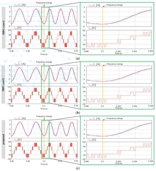 Figure 13 shows the simulation results of the a-phase load current (ioa), a-phase reference current (), and a-phase voltage (van) obtained using the three methods during the transient state of a frequency change in the reference currents. Unlike the magnitude step-change of the reference currents in Figure 12, all three methods produced the same results in the frequency step-change of the reference currents as shown in Figure 13. In Figure 11b, only the frequency change of the reference currents does not result in an abrupt increase of the current and voltage vectors before and after the step-change in the αβ plane. Thus, fast dynamics can be achieved by considering only the adjacent vectors of an optimal vector at a present step.