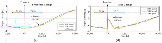 Comparison of the dynamic speed of the actual load current waveforms obtained using the MPC-conv1, MPC-conv2, and proposed methods during step-change in (a) reference current magnitude from −3 A to −1.5 A, (b) reference current magnitude from −3 A to 1.5 A, (c) reference current frequency from 50 Hz to 75 Hz, (d) load change from 20 Ω to 10 Ω.