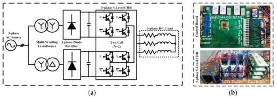 A five-level CHB inverter. (a) Block diagram of the experimental setup and (b) photograph of the prototype setup.
