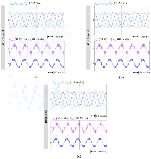 Experimental waveforms of the three-phase load currents (ioa, iob, ioc) and a-phase reference current (), inverter-phase voltage (van), and line–line voltage (vab) during a steady state obtained using the (a) MPC-conv1 method, (b) MPC-conv2 method, (c) proposed method.
