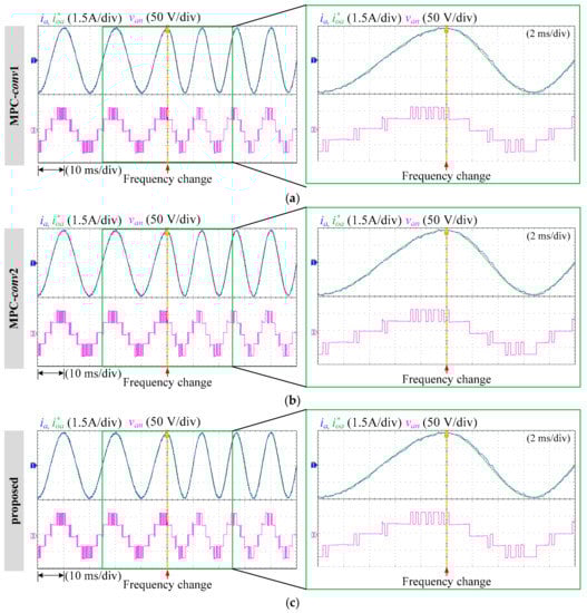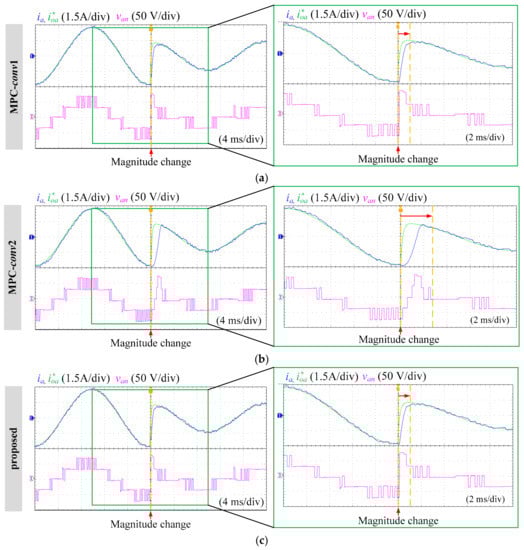 Figure 24 shows the experimental waveforms of the a-phase load current, a-phase reference current, and a-phase inverter output voltage obtained using the three methods, during a transient state where the magnitude of the reference current is suddenly changed from −3 A to 1.5 A. The actual currents from both the conventional and proposed methods accurately follow their reference current, however, with different dynamic speeds depending on each algorithm. It is obvious from Figure 24 that the proposed method has the same dynamic speed as the MPC-conv1 method, which is faster that the MPC-conv2 method. The magnified experimental waveforms during the transient periods are also shown in Figure 24, to clearly illustrate the dynamic performance of the three methods. It can be seen that the proposed method results in load current dynamics that is as fast as the MPC-conv1 method and even much faster than the MPC-conv2 method. In addition, it is shown that the inverter-phase voltage waveform obtained using the proposed method is the same as that of the MPC-conv1 method, although the proposed method utilizes approximately half less candidate voltage vectors compared to the MPC-conv1 method.
