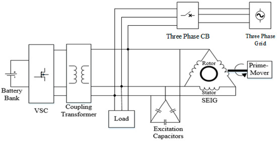 The control scheme of the VSC system described above, with a battery ESS, was used to maintain the system stability. The VSC is used to absorb/inject the difference in power between the SEIG and the load, to ensure the optimal operation of the overall system.