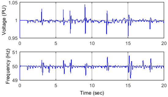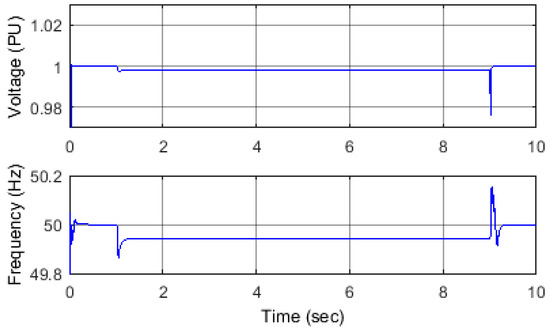 Operation of such a system in islanded mode is stable as long as the generator is loaded by the optimal active and reactive power [32]. Initially, the SEIG should be connected to the main grid to guarantee the machine terminal induced voltage can be built up [37]. Figure 2 shows the voltage magnitude and frequency from a simulation of a 2.3 KVA SEIG loaded by an optimal combination of active and reactive power. In Figure 2, the islanded mode of operation starts at t = 1 s, after disconnecting the SEIG and its local load (as a micro-grid) from the main grid, and ends at t = 10 s, when the micro-grid is reconnected to the main grid. In this case, including during the islanded operating mode, the micro-grid supply voltage is within UK statutory limits for an LV network [38].