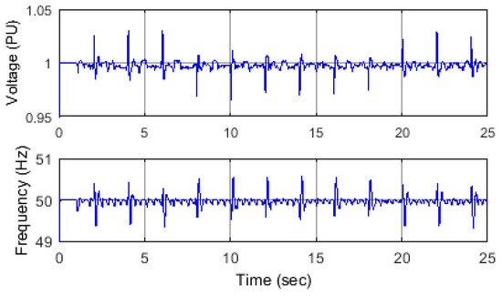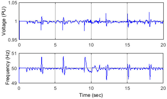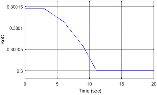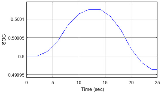 In this scenario the load’s active power was changed to below and above the optimal value. First, the load power decreases in three steps, 10% of its optimal value each time. Then the load power consumption increases in three steps, 10% each time. The SEIG was disconnected from the main grid at time t = 1 s. The duration of each of the 10% steps described above was set to be two seconds. In this scenario, the battery SoC did not reach any of its limits, and therefore the battery was able to be charged and discharged as a result of the load power variations. The change of load power is shown in Figure 6, which also illustrates the compensated power (P-VSC) to/from the ESS via the VSC. It was clear that the SEIG output power was kept constant irrespective of the load variations. A positive polarity of the VSC power indicates that power is absorbed from the micro-grid while a negative polarity indicates that power is injected into the micro-grid to compensate for the load changes. Figure 7 shows that both voltage magnitude and frequency are within their permissible values during the power variation, which were ±10%, and ±1% for the frequency [38]. The SoC of the battery for this scenario is shown in Figure 8, it was obvious that the battery was charging/discharging according to the changes in the load demand: note that the initial SoC was assumed to be 50%.