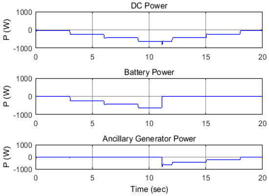 In this scenario, after the SEIG is disconnected from the main grid at t = 1 s, both the load’s active and reactive power are increasing then decreasing in steps of 10% each time, and in time intervals of three seconds per step. The first increase took place at t = 3 s. The battery SoC is assumed to be near its minimum permissible level of 30% which is taken to be the limit of depth of discharge. Figure 9 shows that the increase in load active power is compensated from the ESS though the VSC, while the SEIG output active power remains constant. The same scenario for the reactive power is shown in Figure 10. The voltage magnitude and frequency are within their permissible limits as shown in Figure 11. As shown in Figure 12, the battery discharging process stops at t = 11.1 s, when the battery SoC reaches 30%. At this point, as outlined in Figure 5B, the logic controller circuit will open switch (S1) and close switch (S3) to provide the difference in power from the ancillary generator. The ancillary generator output is shown in Figure 13, it operates until time t = 18 s, when there is no longer any need for power exchange between the AC and DC converter sides.