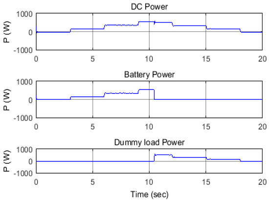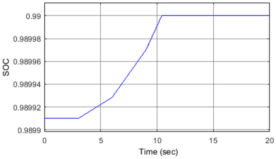 In this scenario, the load’s active and reactive power were decreased below their optimal values and then regains its optimal original condition. However, here the active-reactive power variation was assumed to take place alternatively to show the ability of the controller to optimize the power flow. The active power change was similar to that of the Scenario 2, in both the step magnitude and duration, but in the opposite direction. The reactive power, in contrast, changed in two steps of 10% each. For the sake of this simulation, the maximum allowable battery SoC was set slightly lower than its maximum level, at 99%, and the charging process stopped when it reached this point. Figure 14 shows that the difference in active power between the optimal and the actual load value is stored in the battery via the VSC, while the optimal SEIG active output power remains constant. The same situation for the reactive power is shown in Figure 15. As shown in Figure 16, the voltage magnitude and frequency were within permitted values during these power variations. Figure 17 shows that the battery charging process stops at t = 10.4 s, when the battery SoC reaches 99%. At this point the logic controller will open switch (S1) and close switch (S2), to dissipate the difference in power into the dummy load until t = 18 s (Figure 18), when there is no power exchange between the AC and DC sides of the converter.