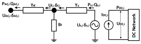 - After calculating all the unknowns in DC and AC networks, an additional iteration is needed to calculate the active power injected into the AC network at the converter side which depend on the DC slack bus power and the converter losses , as shown in Equation (21)During this iteration, the AC network side voltage and reactive power injection into AC network are assumed to be constant.
