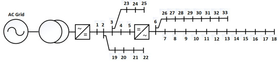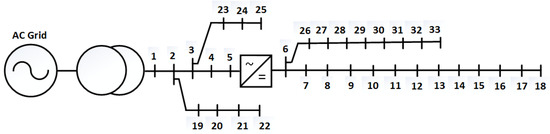 The IEEE 33 bus distribution test network [48] was modified for this case study. The two proposed topologies for AC/DC hybrid distribution system consist of AC network and embedded DC network as shown in Figure 3 and Figure 4. This modeling approach of modification of topologies do not impose any restriction in term of configuration and topology for AC and DC networks, and this design can also accommodate the interconnection of different types of DER into the hybrid AC/DC system.