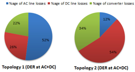 In Table 4 and Table 5, it is concluded in Scenarios (2) and (3) that with DER connected on DC network cause a decrease in power injection from AC into DC network, resulting in a decrease in AC/DC converter and network losses. It is apparent from the results in Table 5 that, if the losses of the converter/inverter, which were used for DER integration are considered, the overall losses in Scenario (3) is effectively reduced.