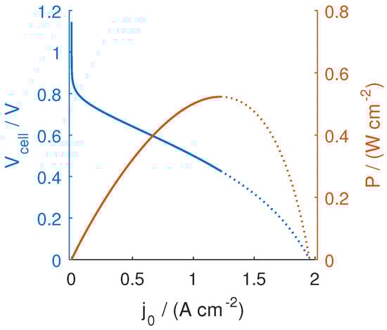 Polarisation curve (blue) and power curve (red) of a plymer electrolyte membrane fuel cell. Dotted line marks the high current branch above the maximum power point.