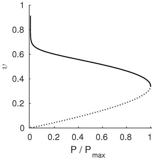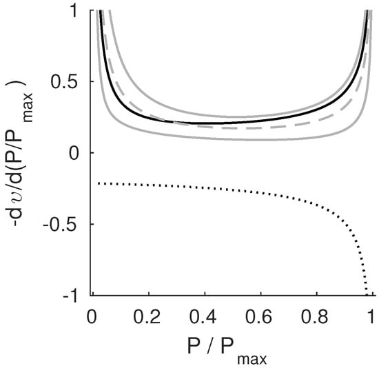 The general trend of the high efficiency branch in Figure 2 is that by decreasing the power, i.e., operating at partial load or oversizing the fuel cell, the efficiency increases. This efficiency gain by load reduction, shown in Figure 3, is roughly constant at medium loads. However, close to equilibrium, i.e., in the activation region, and close to maximum power, reducing the power gains relatively high efficiency improvements. For practical purposes, the efficiency gain in the activation region is irrelevant because a fuel cell producing no current is useless. However, especially in the high power region, the efficiency gain asymptotically reaches infinity at the MPP, i.e., a slight power reduction gains a large efficiency increase. This suggests that the fuel cell should always be at least slightly oversized. Depending on the application, further oversizing, i.e., investing in a bigger and heavier fuel cell in order to gain a more efficient process, might be beneficial. To aid such decision, Figure 3 can be used as a performance cost–benefit curve. A remarkable property of this curve is that it is insensitive to variations of all design parameters of the model. A 10-fold increase and decrease of , D, , , , , have been tested but show no visible change of the curve. To further illustrate this point with practical data, 41 polarisation curves from Ref. [23] have been analysed in the described fashion. The grey curves in Figure 3 mark the average value and the 99% confidence interval (i.e., a measured point has a 99% probability of lying within this interval) of the analysed experimental curves. The relatively narrow confidence region demonstrates the fundamental nature of this cost–benefit curve, which makes it a valuable design tool.