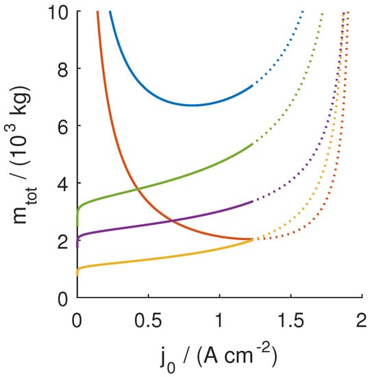 Mass of the fuel cell system and its components as function of working point current density for a reference flight mission with a power demand of MW and an energy demand of MWh, i.e., a medium haul flight [16]. Blue: total mass of the system; Red: mass of the fuel cell; Yellow: mass of the hydrogen fuel; Purple: mass of the empty tank; Green: mass of the tank system (tank+hydrogen). Dotted lines mark the branch above the maximum power point.