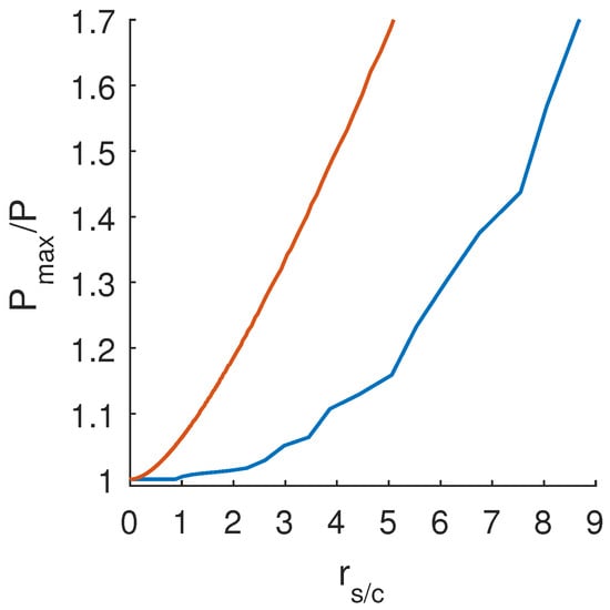 The relationship between and is shown in Figure 6, where the red curve marks the spherical tank design mentioned above. The semi-logarithmic plot reveals that for this design, the optimal oversize grows exponentially with for systems with , i.e., systems with dominating storage weight. For systems with , i.e., systems with dominating converter weight, oversizing is negligible. The blue curve shows a more complex tank design discussed in the next section. This tank system allows for venting of hydrogen, which seems to shift the curve towards higher but keeps the exponential relationship between and for .