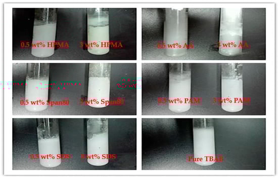 Photograph of Tetrabutylammonium bromide (TBAB) hydrate with different anti-agglomerants after 1.5 h.
