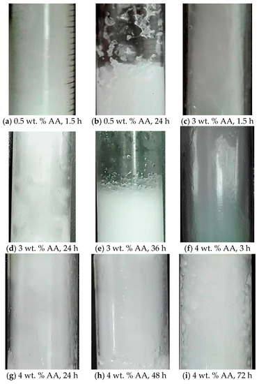 The stable time of hydrate slurry is an important parameter for assessing the performance of anti-agglomerant. The photographs of TBAB hydrate with different amounts of AA addition are displayed in Figure 2. The TBAB concentration is 16.2 wt. %. The optimal anti-agglomerant concentration was determined by measuring the stable time of the hydrate slurry. As shown in Figure 2, after 24 h, the hydrate with 0.5 wt. % AA agglomerated, while the hydrates with 3.0 wt. % AA still maintained the state of slurry. However, another 12 h later, the hydrate slurry with 3.0 wt. % AA addition also exhibited agglomeration. As the AA dosage increased to 4 wt. %, the TBAB hydrate slurry remained anti-agglomeration up to 72 h. This indicates that the anti-agglomeration duration of AA is positively correlated with its concentration used. The minimum AA dosage required for 16.2 wt. % TBAB solution to maintain slurry state in 72 h is about 4 wt. %.