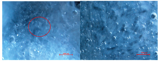 The micrographs of TBAB hydrate with and without AA addition are shown in Figure 4. The photos on the right-hand side are the enlarged view of the red circle in the photos of the left side. Figure 4a shows the micromorphology of hydrate crystals generated in the TBAB system. It could be found that the pure TBAB hydrate particles are rod-like crystal of relatively large size that stick together and grows in clusters. Figure 4b shows the morphology of hydrate formation in the TBAB/AA system; it can be seen that the TBAB hydrate particles with small size are dispersed in the solution. This indicates that the anti-agglomerant played an important role in preventing TBAB hydrate particles from aggregation. However, the anti-agglomeration mechanism of AA still needs further study.