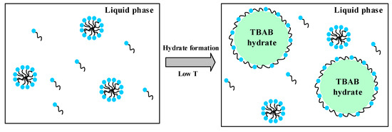 In the past, the formation of water-in-oil emulsions has been proposed as a requirement for hydrate anti-agglomeration [11,16,18,19,20]. However, the AA proposed in this work is effective in an oil-free system. The anti-agglomeration mechanisms of AA are schematically shown in Figure 5 [21]. The nonionic surfactant cocamidopropyl dimethylamine forms micelles in the aqueous solution before hydrate generation. Because the hydrogen bonds between amino groups and water molecules is stronger than hydrogen bonds between water molecules, the cocamidopropyl dimethylamine can form hydrogen bonds with the water molecules on the surface of the hydrates. Once hydrates form in the solution, some of the micelles dissociate and the cocamidopropyl dimethylamine molecules adsorb on the surface of hydrate crystal nucleus. Meanwhile, the hydrophobic tail of the surfactant will cover the surface of the hydrate particles because the dielectric constant of TBAB hydrates is less than that of water [21], thus preventing the hydrates from growth and further agglomeration.