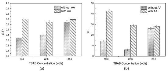 As can be seen from Figure 6, for the same TBAB concentration, the gas storage capacity of hydrate formation in the presence of AA was much higher than that without AA. Taking 19.3 wt. % TBAB as an example, relative to pure a TBAB system, the gas storage capacity of hydrate formation in the TBAB/AA binary system increased by 87.8% (from 10.66 mmol/mol H2O to 20.02 mmol/mol H2O). This is because TBAB hydrate particles would agglomerate and adhere together in the process of hydrate formation without AA addition, thus preventing the CO2 from getting into the TBAB hydrate cage. As for TBAB/AA binary system with the same TBAB concentration, the presence of AA can prevent TBAB hydrate aggregation, thus can increase the contact area between CO2 and TBAB hydrate particles, so that more CO2 gas can get into TBAB cages. For a pure TBAB system, the gas storage capacity increased with TBAB concentration. However, for the TBAB/AA binary system, the gas storage capacity was approximately equal in three different TBAB/AA binary systems, which means the synergistic effect of AA and TBAB on hydrate-based CO2 separation was weakened with the increase in TBAB concentration. This is because the amount of TBAB hydrate cages generated in the solution increased with TBAB concentration in the pure TBAB system, so that more CO2 gas can get into the cages even if hydrate particles adhere to each other. TBAB hydrate particles would disperse in the solution with AA addition, thus increases the contact area between gas phase and hydrate particles, which will lead to an increase of gas transfer. Actually, because only 512 cavity of TBAB hydrate can accommodate gas molecules, and each TBAB hydrate has three 512 cavity, 1 mole TBAB hydrate can capture 3 mol CO2. The amount of CO2 in the feed gas was about 1.55 mol, thus the amount of CO2 relative to the amount of TBAB cages was insufficient in the three concentrations (as shown in Table 3). Therefore, after achieving phase equilibrium, the gas storage capacity was approximately equal in three different TBAB/AA binary systems even if the TBAB hydrate particles dispersed in the solution.