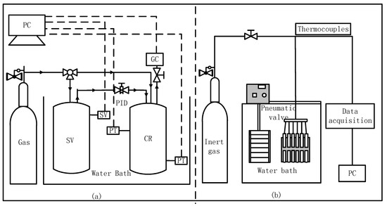 Figure 8a shows a schematic diagram of CO2 separation apparatus used for hydrate kinetic study. The experimental equipment mainly consists of a cylindrical crystallizer (CR) and a balance tank (SV), which are immersed in a water bath for temperature control. CR and SV are made of high-pressure stainless steel, so as to withstand pressure up to 25 MPa, and the inner volume is 336 mL and 1350 mL, respectively. The temperature and pressure of CR and SV are measured by a Pt100 temperature sensor (JM6081, Hefei Heavy Tripod Machinery and Electrical Equipment Co., Ltd., Hefei, China.) with an accuracy of ±0.1 K and a pressure sensor (Model 552, Boxborough, MA, USA) with an accuracy of ±0.02 MPa, respectively. All the temperature and pressure data are collected and stored in a computer (PC). There are two visualization windows on the front and back of the CR to observe the process of hydrate formation. The CR is equipped with an electromagnetic stirrer (400 r/min, Chengbang Science and Technology Co., Ltd., Sichuan, China) for accelerating the gas and liquid mixing. The pressure of CR can be maintained at a stable value through the PID control valve (E-ATR-7/250/I, Atos Co., Ltd., Sesto Calende, Italy) between CR and SV. The composition of residual gas in the CR after the hydrate formation and dissociation were analyzed by gas chromatography (GC522, Shanghai Wufeng Scientific Instrument Co., Ltd., Shanghai, China).